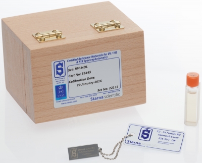 A new Certified Reference Material from Starna gives 14 well-defined, evenly spaced and proven interference-free peaks for spectrophotometer wavelength qualification covering a wavelength range from 240 nm to 795 nm. Rare earth oxide solutions have been used for wavelength calibration for many years and are accepted for this purpose by all the pharmacopoeias. This reference combines holmium and didymium (neodymium and praseodymium) and covers the most popular wavelengths in UV and visible spectrophotometry. Because peak values measured on sharp peaks are wavelength dependent, the Calibration Certificate accompanying each reference gives actual values measured at nine different bandwidths from 0.1 nm to 5 nm, covering most operating situations. Certified values are all fully traceable to NIST, and Starna is accredited to both ISO Guide 34 as a Reference Material producer and ISO 17025 (0659) as a Calibration Laboratory. Like all Starna reference materials, this reference carries a lifetime guarantee.